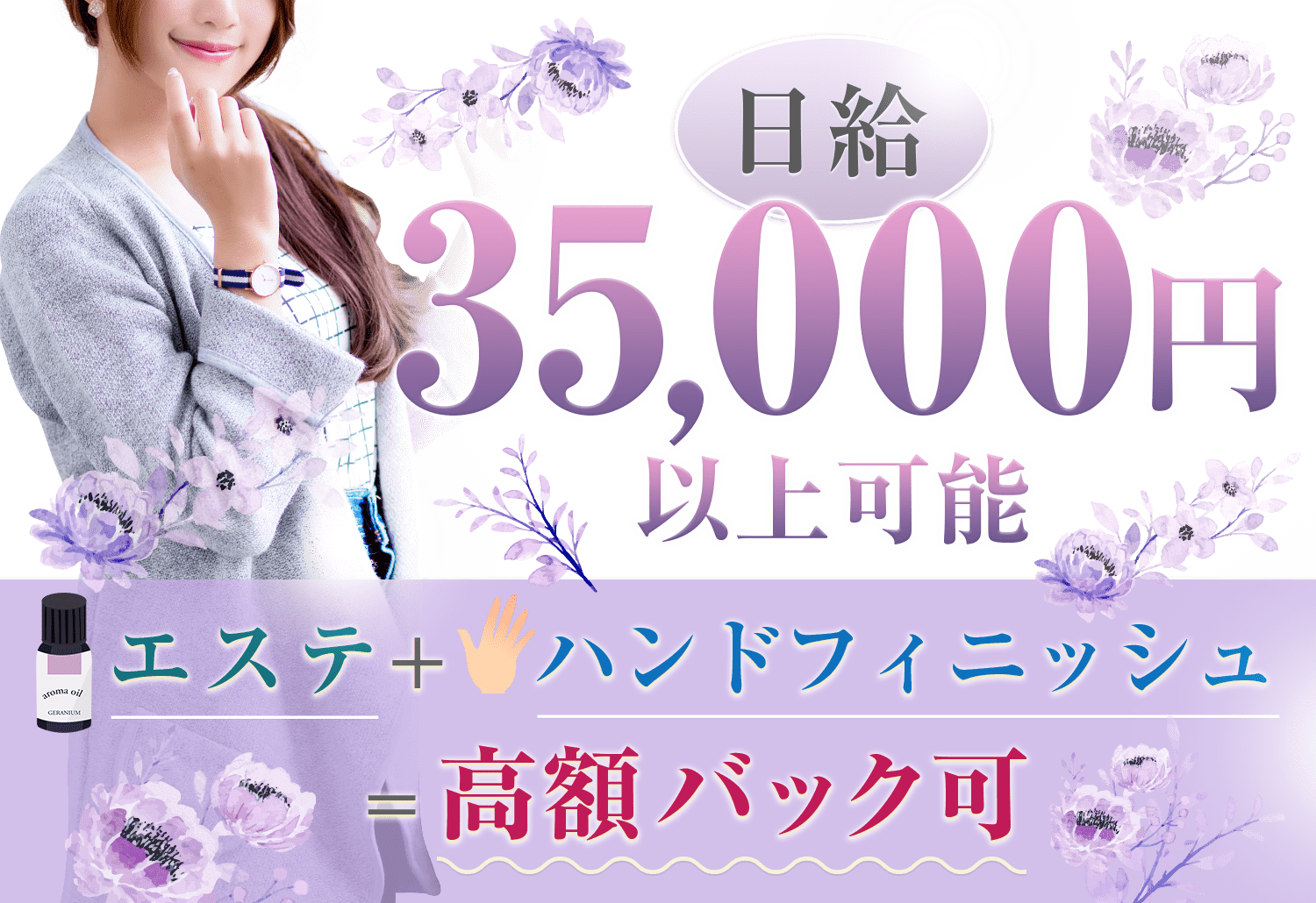 お仕事内容はオイルマッサージと回春サービス(手コキ)。ヘルスサービスは一切ありません。病気のリスクなく、安心してお仕事していただけます。