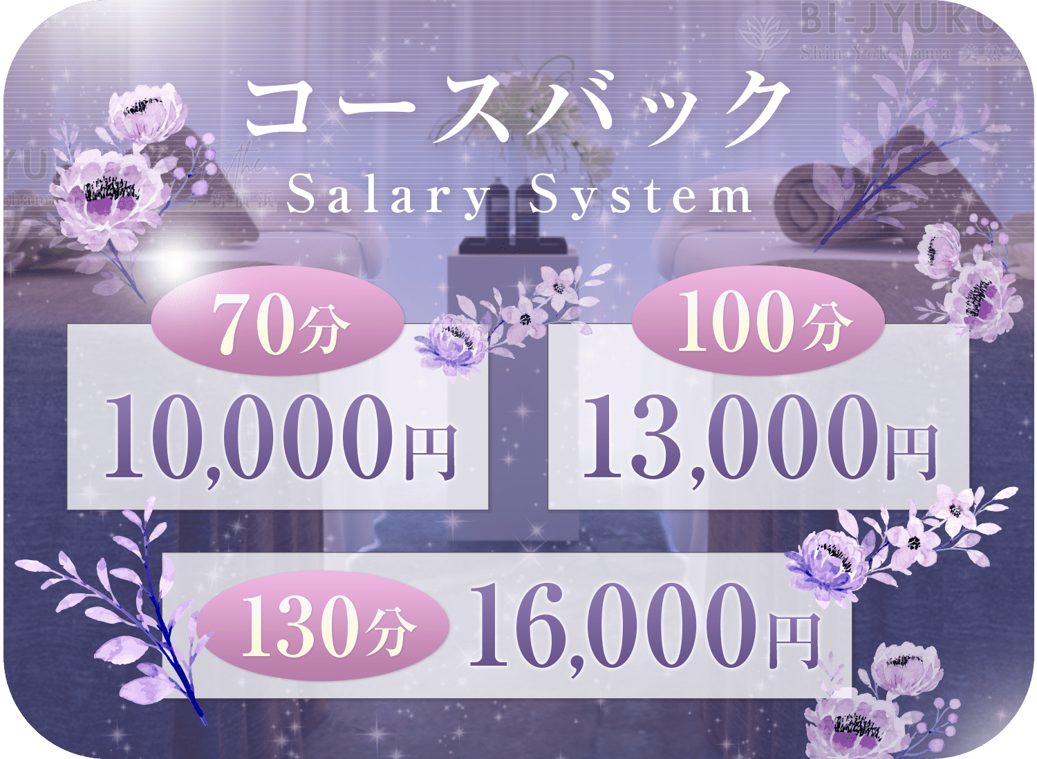 | お給料 | ★日給30,000円以上可能 ★完全日払い制 ★お友達紹介手当あり ★ノルマ・罰金・雑費など引かれものなし ーーーーーーーーーーーーーーー 70分コースバック…10,000円 100分コースバック…13,000円 130分コースバック…16,000円 本指名料バック →1,000円(全額バック) ーーーーーーーーーーーーーーー |