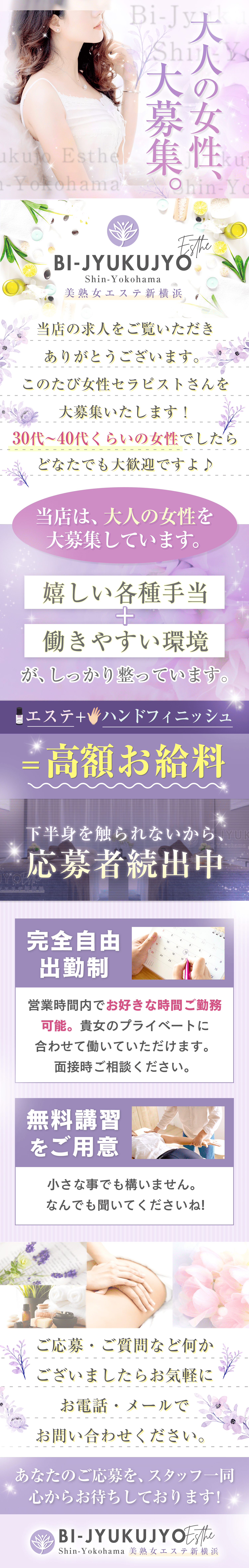 24時間ご応募OK!お問い合わせだけでも大丈夫なので、お気軽にご連絡ください。 LINE ID:bijyukujyo-esthe TEL:045-473-5603 MAIL:bijyukujyo.esthe.shinyokohama@gmail.com |